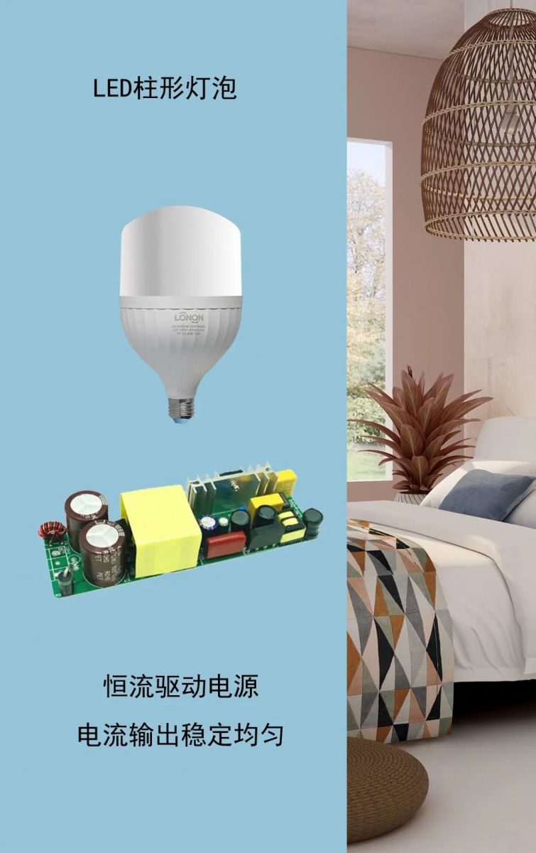 朗能LED柱形燈泡,采用恒流驅(qū)動電源方案,確保電流穩(wěn)定輸出、無可視頻閃。