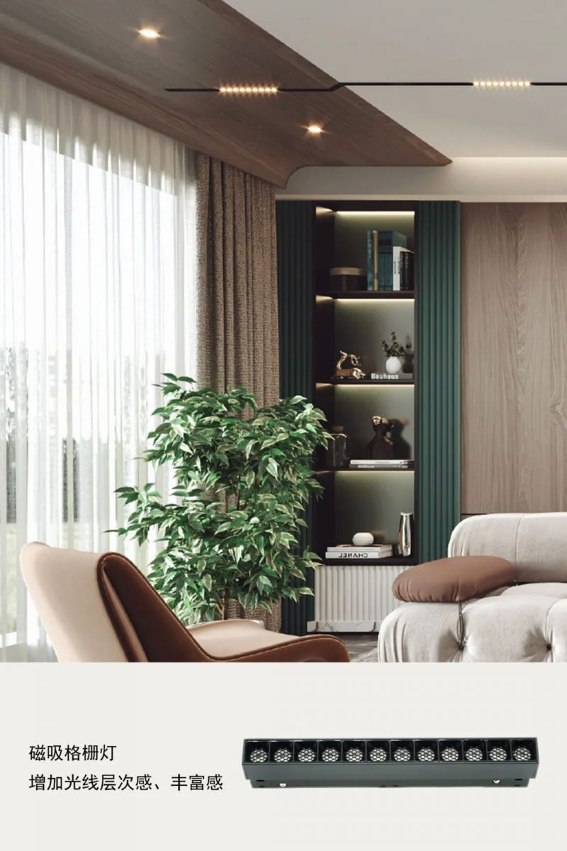 全屋無主燈,要配置磁吸泛光燈、磁吸格柵燈、磁吸軌道射燈、防眩筒射燈、LED燈帶等燈具及若干配件。