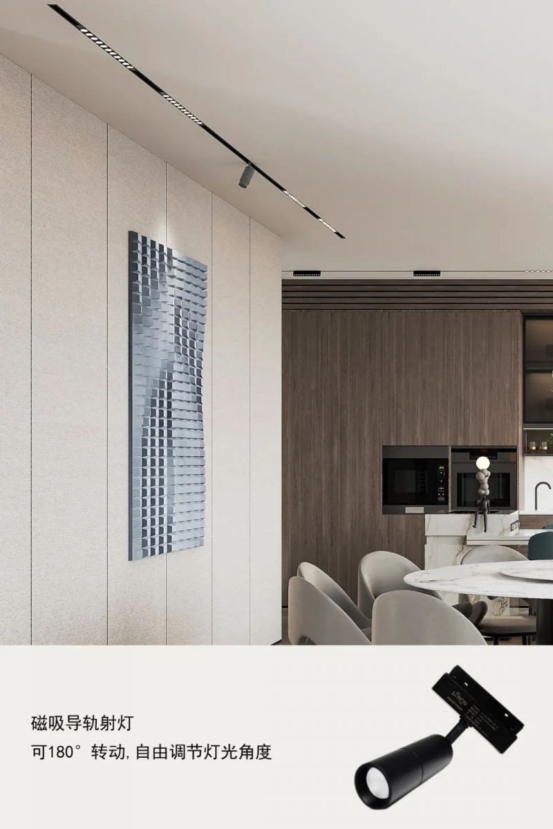 磁吸軌道射燈,主要用來做重點(diǎn)照明,營造光照氛圍。