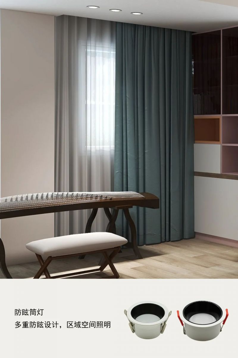 防眩筒燈,主要負(fù)責(zé)區(qū)域照明。比如玄關(guān)、過道、天花、臥室等空間,都適合安裝筒燈。